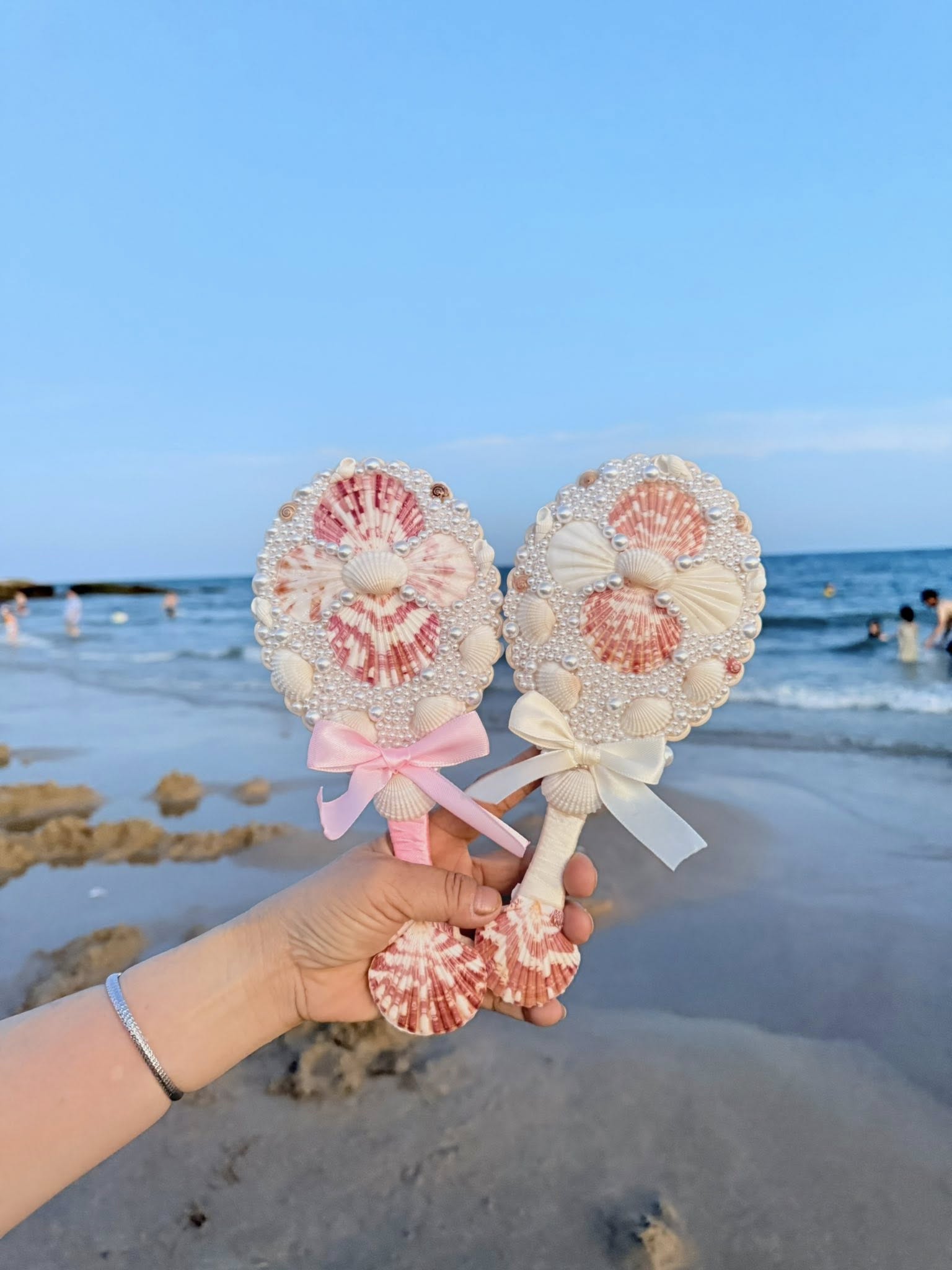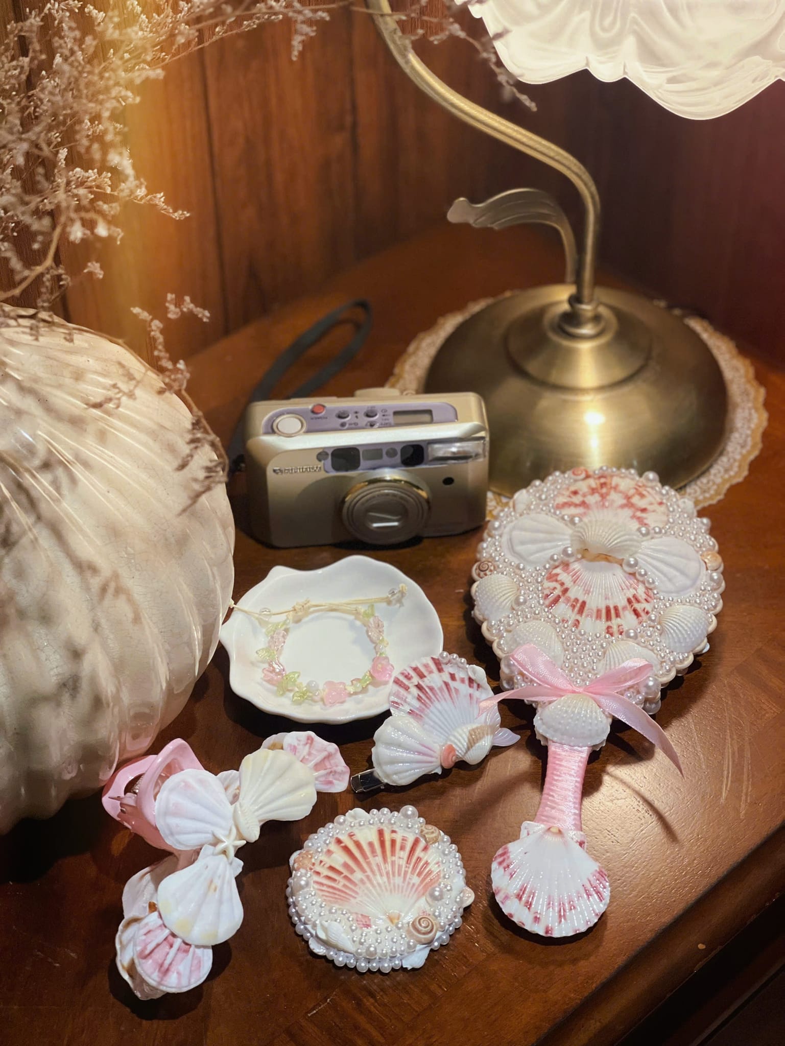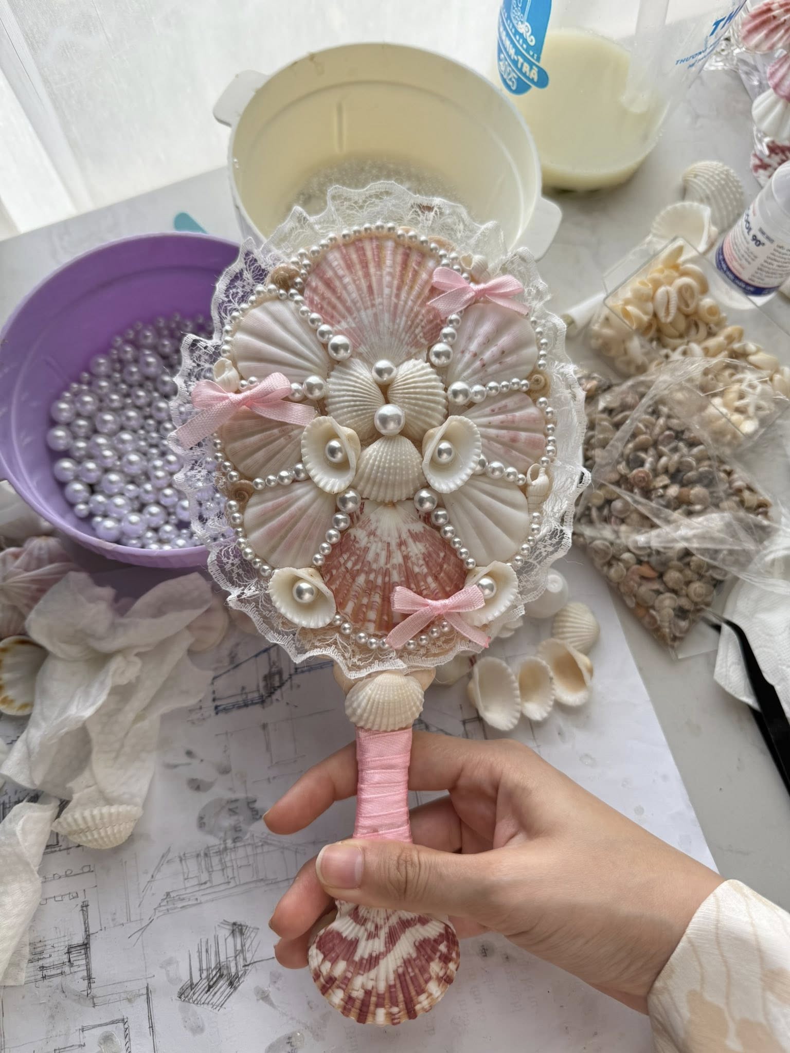 Những chiếc vỏ sò, vỏ ốc được Ngọc thu mua của người chuyên đi nhặt vỏ ốc trên bãi biển kiếm sống. Họ sẽ ngâm, rửa sạch và khi mua về, Ngọc chỉ rửa qua để loại bỏ cát bụi. Sau đó, cô tiến hành gắn vỏ sò, vỏ ốc và các phụ liệu lên những đồ vật cần trang trí, phết sơn bóng bằng keo gốc nhựa. Bí quyết sơn bóng giúp sản phẩm bền, đẹp hơn. Mỗi công đoạn đều cần sự tỉ mỉ và mất nhiều thời gian. Trung bình, để trang trí một chiếc gương cầm tay, thợ lành nghề phải mất khoảng 3 tiếng. Mỗi ngày làm việc, họ chỉ có thể làm tối đa 3-4 chiếc gương như vậy.