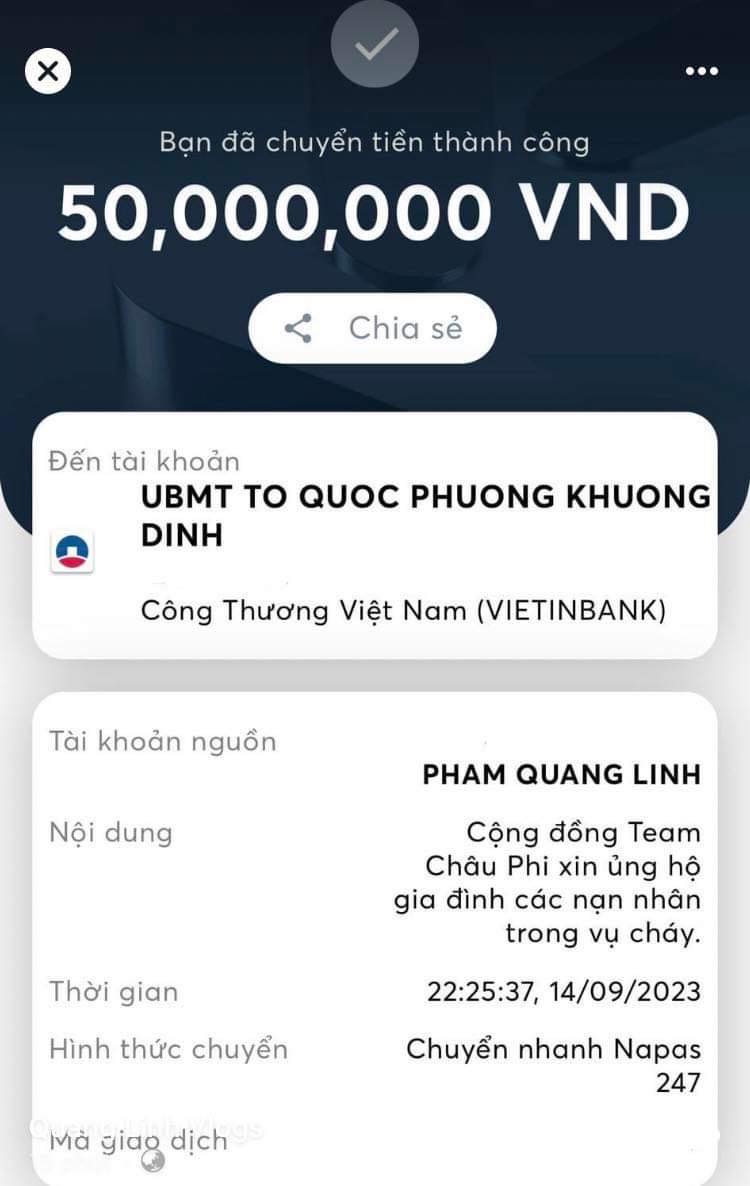 Một trong số những cái tên có hành động nhanh chóng chính là Quang Linh Vlogs và team châu Phi của anh. Ngay giữa đêm, 50 triệu đồng đã được chuyển khoản ngay cho Ủy ban Mặt Trận Tổ Quốc Việt Nam tại phường Khương Đình.