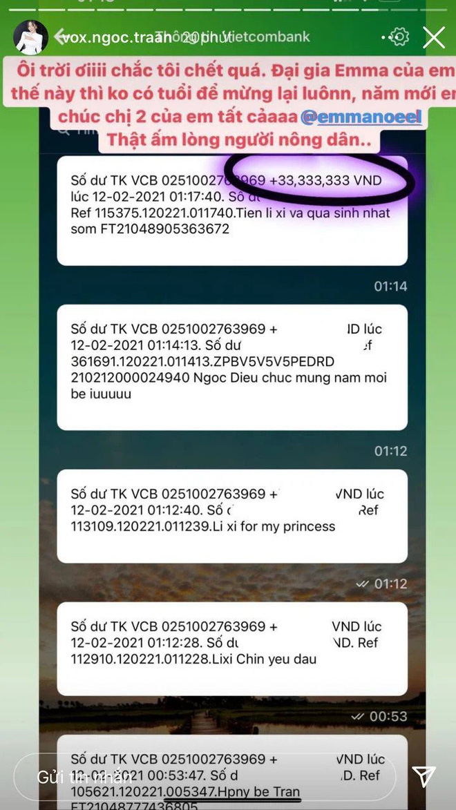 Nhìn chị em gái nhà người ta mà phát thèm không? Có bà chị như chị của Võ Ngọc Trân hẳn là ao ước của rất nhiều người. Nhưng đây là số tiền Ngọc Trân nhận được đâu từ hồi mùng 1 Tết rồi, đến hết Tết không biết tổng số dư đã tăng lên đến con số nào nữa