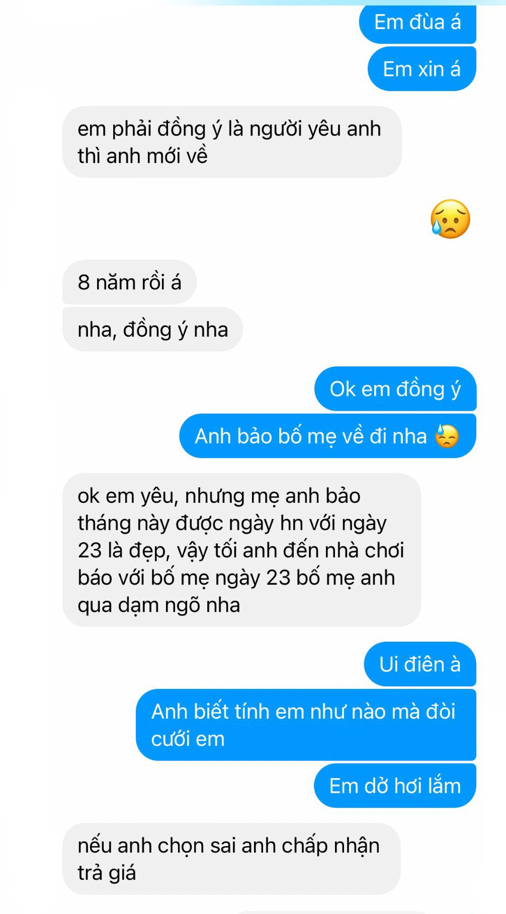Diễn biến tiếp theo không ai lường được. Chàng trai nhanh chóng đòi mang trầu cau qua rước dâu luôn khiến cô gái giật mình, hoảng hốt. "Bảo bố mẹ anh về đi, em không mở cổng đâu. Anh bảo bố mẹ anh về đi, em đùa á", cô gái nhắn tiếp.
