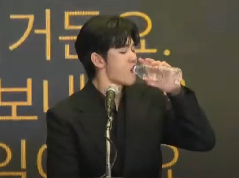 Trong suốt buổi họp báo, bên cạnh việc nói đến đâu khóc đến đó, nam diễn viên được mệnh danh là trai đẹp ngoài hành tinh còn liên tục uống nước. Điều này khiến cộng đồng mạng không thể không quan tâm.