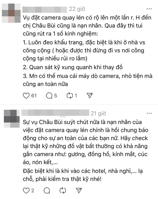 M.H viết: "Mình thật sự đã rất vô tư, không cảnh giác dù ở nơi công cộng. Mình từng chỉ nghĩ sẽ đối phó ra sao nếu nhìn thấy người đang giơ điện thoại quay mình hoặc ai đó nhưng lại chưa từng đề phòng việc camera ẩn ở những nơi có thể ghi lại hình ảnh nhạy cảm. Qua việc của Châu Bùi, thấy sợ và hoang mang. Giờ cũng phải học hỏi tips của mọi người để phòng tránh và cũng tập quan sát kỹ càng hơn khi đến những nơi công cộng".