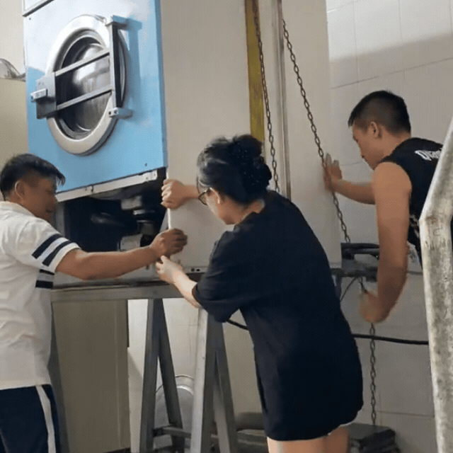 Vì gia đình làm tiệm giặt là nên so với việc chuẩn bị những dụng cụ này thiết thực hơn hẳn. Các khung sắt thép được làm cao, máy giặt được kê lên cao với sức trợ giúp của palang xích kéo tay. Những dụng cụ này cần có kinh nghiệm để thiết kế và lắp đặt trong nhà. Với những người không có kinh nghiệm, nên thuê thợ để đảm bảo an toàn.