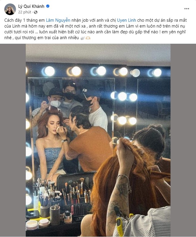 Sáng 9/5, nhiều sao Việt có bài đăng chia buồn trước sự ra đi đột ngột ở tuổi 30 của Lâm Nguyễn - chuyên viên trang điểm có tiếng từng làm việc với nhiều nghệ sĩ. Theo đó trên trang cá nhân, Jun Phạm đăng tải hình ảnh khi làm việc cùng Lâm Nguyễn và nhắn nhủ: "Thương em nhiều lắm. Dù ở bất cứ nơi nào anh cũng chúc em sẽ mãi hạnh phúc và luôn làm đẹp cho đời như em đã luôn như vậy nha".