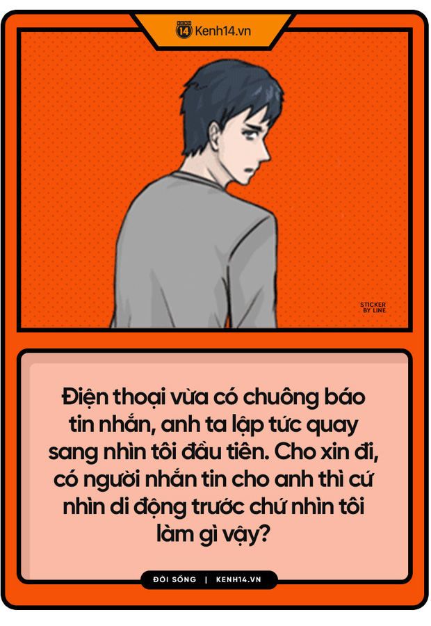 2. Điện thoại vừa có chuông báo tin nhắn, anh ta lập tức quay sang nhìn tôi đầu tiên. Cho xin đi, có người nhắn tin cho anh thì cứ nhìn di động trước chứ nhìn tôi làm gì vậy?