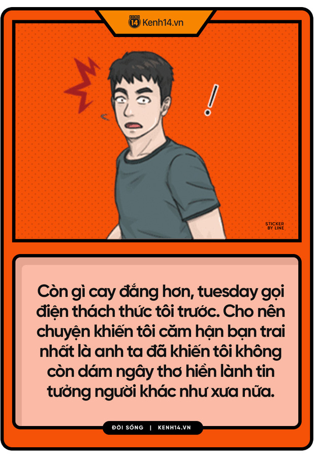 10. Còn gì cay đắng hơn, tuesday gọi điện thách thức tôi trước. Cho nên chuyện khiến tôi căm hận bạn trai nhất là anh ta đã khiến tôi không còn dám ngây thơ hiền lành tin tưởng người khác như xưa nữa.