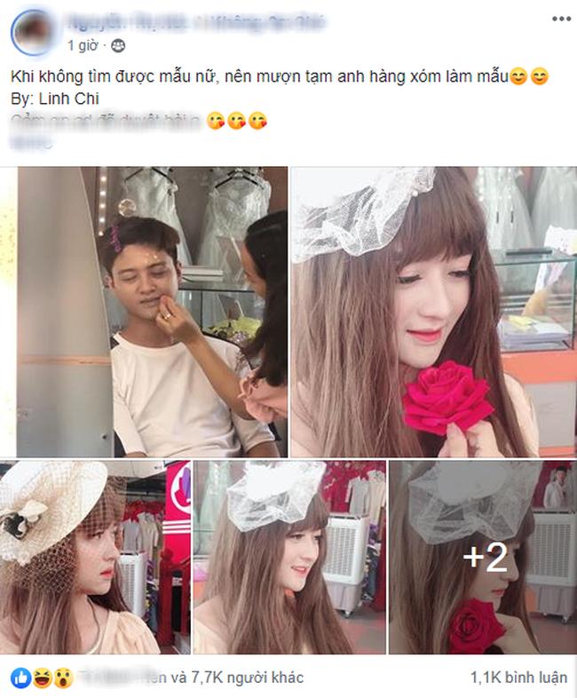 Chủ nhân bức ảnh có nickname Linh Chi chia sẻ: ''Khi không tìm được mẫu nữ, nên mượn tạm anh hàng xóm làm mẫu".