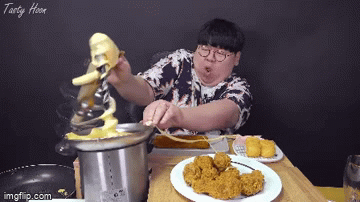 Thay vì nhanh tay tắt chiếc máy, chàng thanh niên này bất ngờ có những động thái nhắm mắt, nín thở vì quá bất ngờ trước sự cố khi đang làm video. Sau vài phút lấy lại tinh thần, chàng thanh niên với khuôn mặt như muốn khóc bất ngờ trấn an bản thân bằng việc cầm lấy một miếng gà rán rồi ăn ngấu nghiến, vừa thưởng thức miếng gà béo ngậy, Hoon còn ăn cả những phần phô mai vương vãi trên bàn.