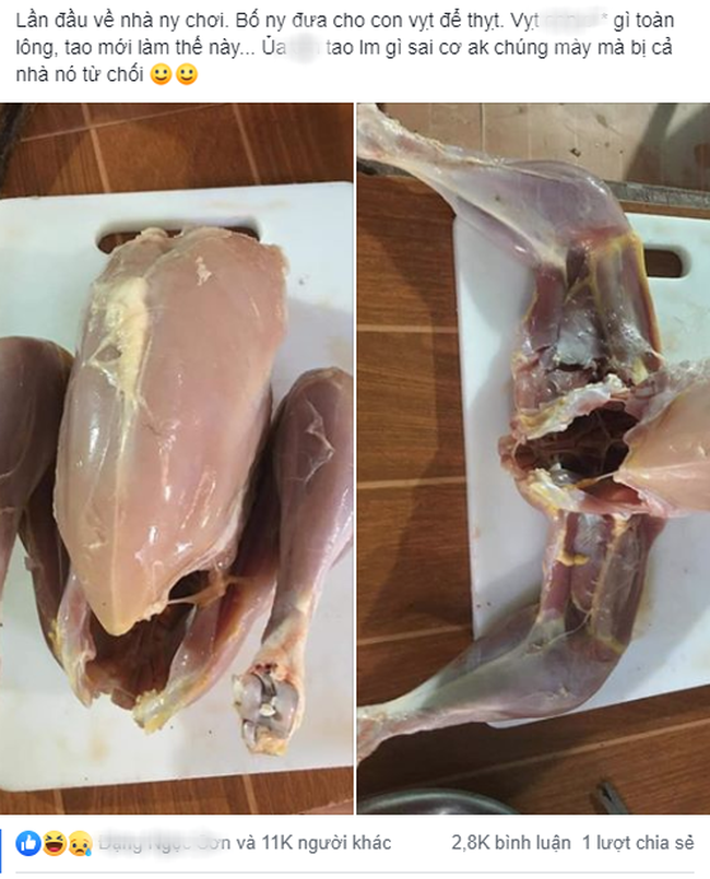Anh chàng đã chụp ảnh lại và đăng tải lên fanpage có hàng triệu lượt thích với caption rất đỗi đau thương: ''Lần đầu về nhà người yêu chơi. Bố người yêu đưa cho con vịt để thịt. Vịt gì mà toàn lông, mình mới làm thế này. Ủa? Mình làm gì sai hả các bạn, để cả nhà người yêu mình từ chối?''.