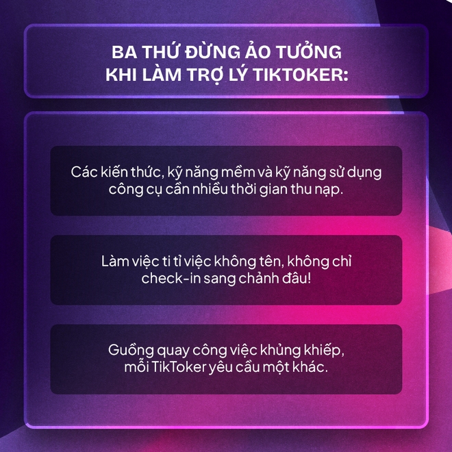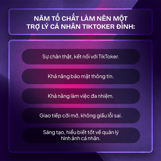 "Nghề trợ lý TikToker cần sự kín đáo và bảo mật. Nếu không phải là người tinh tế và kín đáo, thì khuyên bạn đừng nên apply. Muốn ghi điểm thì phải xây dựng được mối quan hệ chân thật, chứng minh mình là người thiện lành thì mới được tín nhiệm." - Cam Lạc mách nhỏ.