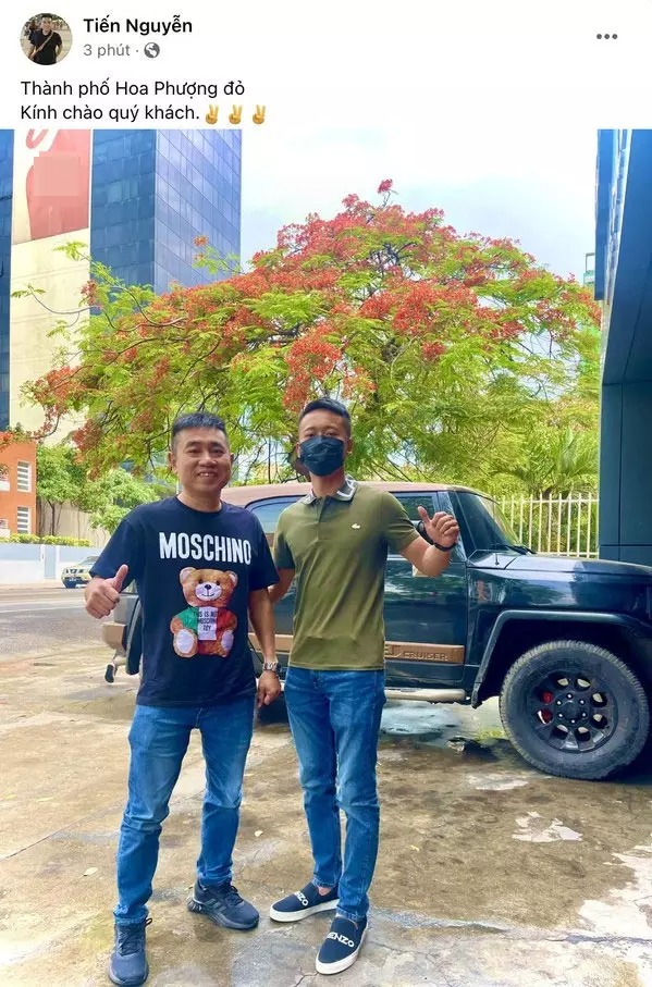 "Thành phố hoa phượng đỏ kính chào quý khách", cả 2 cười tươi không cần tưới bên cạnh một chiếc ô tô.