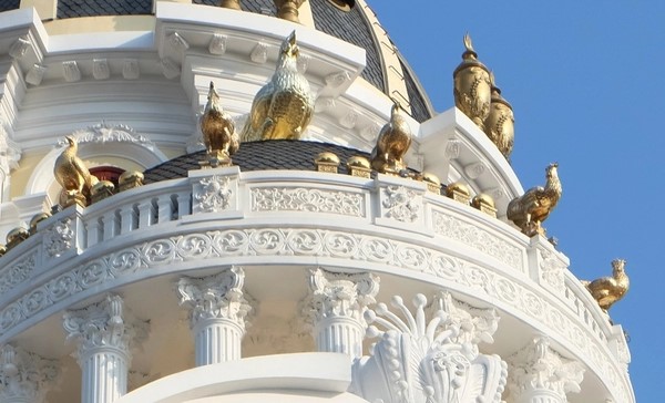 Điểm đặc biệt nhất của toà lâu đài này chắc chắn phải kể đến 6 con gà vàng được đúc đồng đặc nguyên khối, sau đó dát một lớp dày bằng vàng đạt chuẩn chất lượng phía bên ngoài để không sợ bị thời tiết bào mòn, tàn phá. Ước tính số tiền bỏ ra để làm 6 con gà này lên đến gần 20 tỷ đồng. Trong đó một con gà trống cất tiếng gáy, những con còn lại xếp hình cánh cung xung quanh.