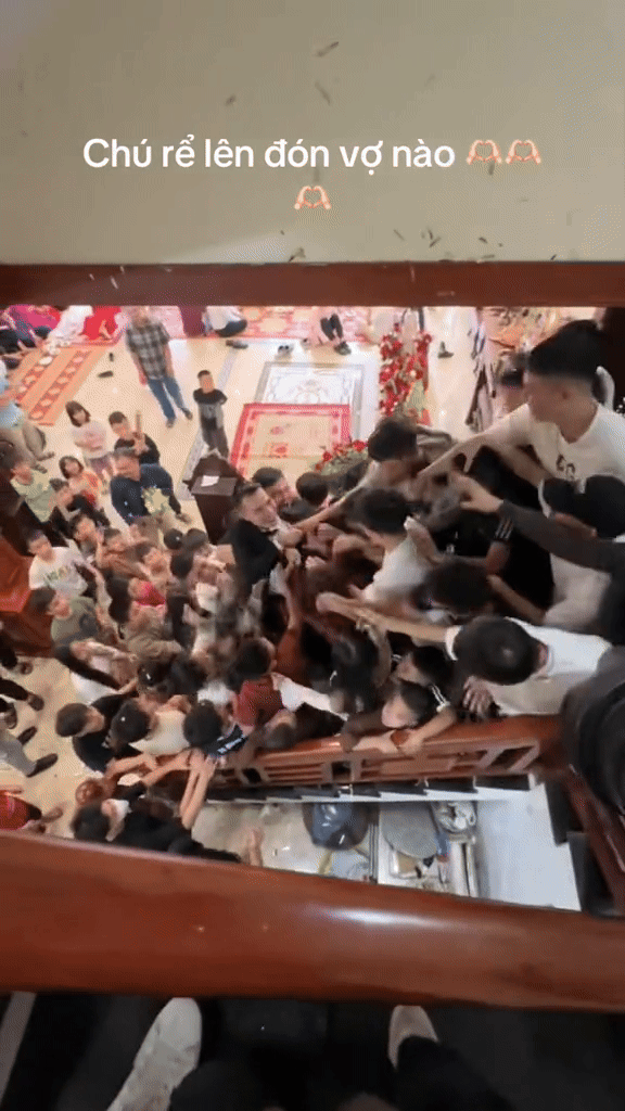 Theo như clip chia sẻ, chú rể đứng trên cầu thang chật kín người. Chú rể ném lì xì màu đỏ như một cách "tán lộc" và được đám đông xung quanh vây tới.