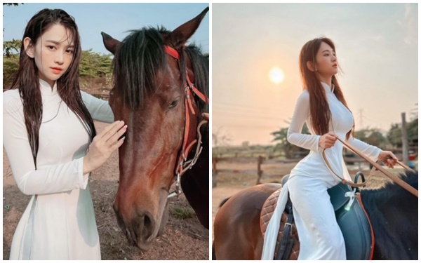 Thế nhưng, cô nàng lại diện bộ trang phục này cùng với một chú ngựa. Mặc áo dài thì nhiều người đã mặc, nhưng mặc áo dài cưỡi ngựa thì chắc mới có mình Lê Bống.