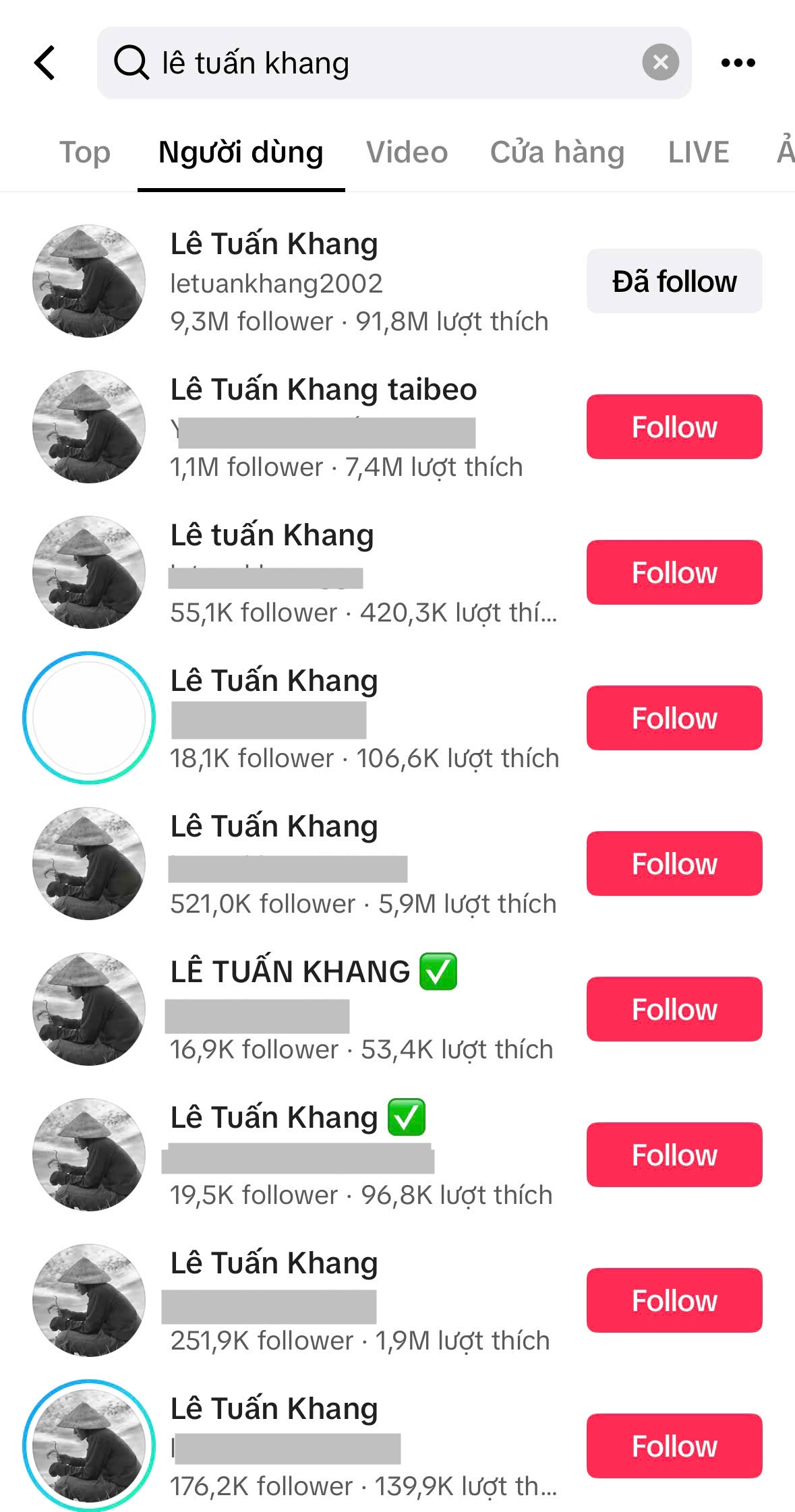 Hiện tại khi gõ từ khóa Lê Tuấn Khang ở nền tảng TikTok thì có khoảng 15-20 nick đều có tên Lê Tuấn Khang và ảnh đại diện tương tự. Điều đáng nói là những tài khoản này cũng thu về lượt follow và view khá nhiều. Chưa dừng lại ở đó, đã bắt đầu có nhiều video cắt ghép hoặc lợi dụng hình ảnh chàng trai 22 tuổi này nhằm trục lợi bán hàng hoặc lừa đảo.