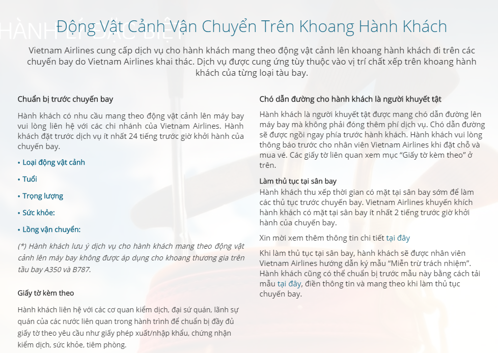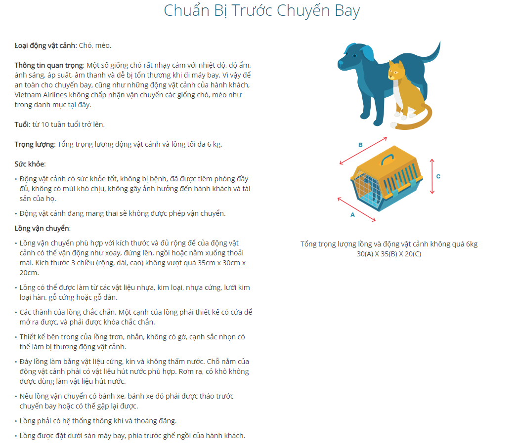 Thứ 2, Vietnam Airlines cho phép mang thú cưng lên khoang hành khách với điều kiện thú cưng phải được đặt trong lồng và niêm phong cẩn thận (trừ chó dẫn đường dành cho người khuyết tật). Hạng nào cũng được không phân biệt phổ thông hay thương gia.