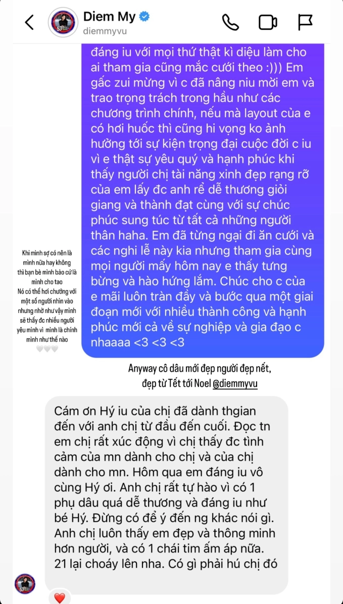 Mới đây, trên trang cá nhân của mình, Trang Hý đã đăng những dòng tin nhắn cô trò chuyện cùng Diễm My 9x về outfit của cô tại buổi tiệc trọng đại của nữ diễn viên. Tất nhiên, Diễm My 9x gửi lời động viên nữ YouTuber giữa làn sóng chỉ trích của dư luận, đồng thời khẳng định "anh chị rất tự hào vì có một phụ dâu quá dễ thương và đáng yêu như bé Hý".