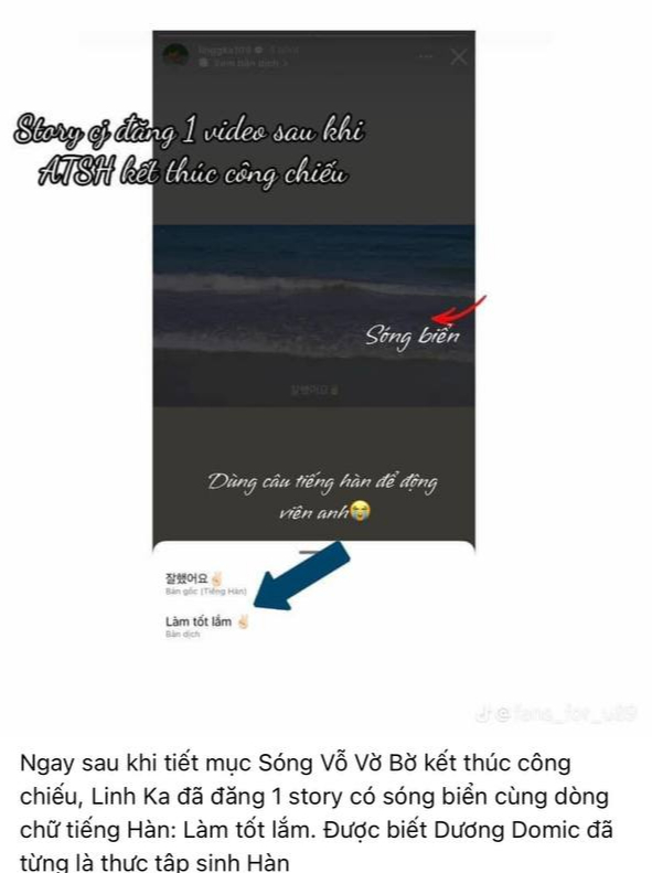 Nói về loạt hint hẹn hò giữa Linh Ka và Dương Domic, đầu tiên cư dân mạng đặt nghi vấn về bài đăng về "sóng biển" của Linh Ka trên trang cá nhân, kèm theo đó là lời động viên viết bằng tiếng Hàn. Trùng hợp thay thời điểm mà Linh Ka đăng bài chỉ sau 1 ngày Dương Domic hoàn thành bài biểu diễn Sóng Vỗ Vỡ Bờ ở Anh Trai Say Hi. Việc Linh Ka chú thích bằng tiếng Hàn được netizen cho là cố tình để Dương Domic đọc, vì nam ca sĩ từng có thời gian sang Hàn Quốc làm thực tập sinh.