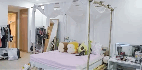 Trong vlog, Linh Ngọc Đàm dần giới thiệu cho mọi người về không gian phòng ngủ của mình và Quang Cuốn. Không gian sống của Linh Ngọc Đàm khá nữ tính với giường pallet ngập thú bông và cả một chiếc kệ lớn để trưng bày nước hoa. Cô nàng cũng sắm cả máy chiếu để thoải mái xem phim trong phòng.