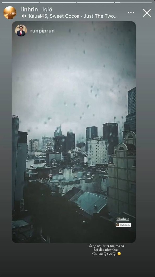 Đến khi người yêu đã về nước, "nhìn mưa nhớ mình", Linh Rin lại lên sóng ngay story mới, thể hiện nỗi nhớ nhung của những người đang yêu nhau, ở gần bên mà vẫn gặp được.