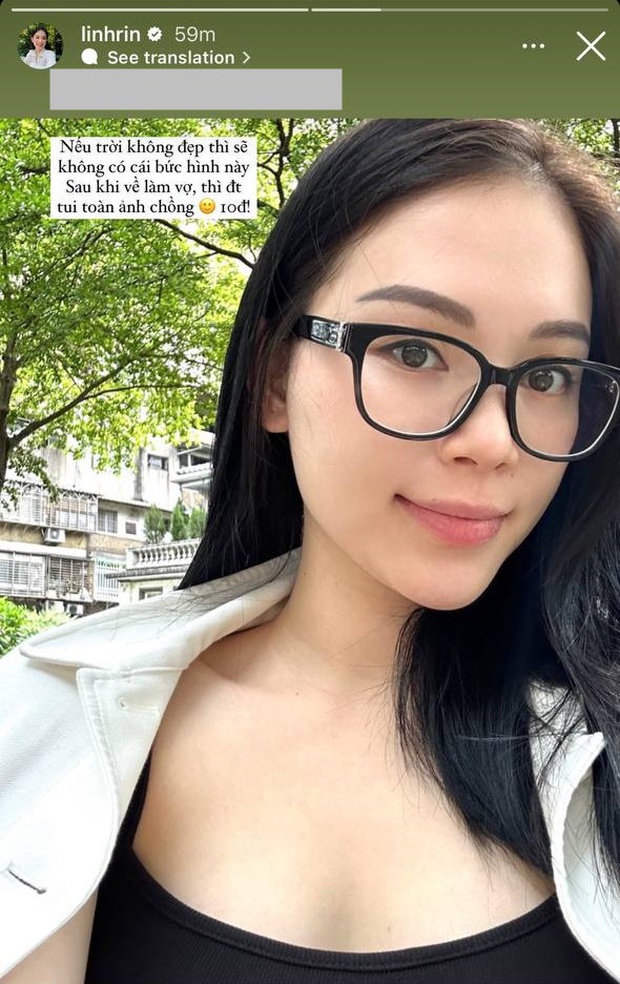 Không những thế, Linh Rin còn bày tỏ sự nghiện chồng của mình. Cô tự đăng ảnh selfie và đính kèm chú thích: “Nếu trời không đẹp thì sẽ không có cái bức hình này. Sau khi về làm vợ thì điện thoại tui toàn ảnh chồng. 10 điểm!” .