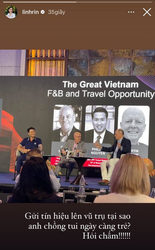 Tuy nhiên mới đây, nàng dâu hào môn bất ngờ chia sẻ những khoảnh khắc trong chuyến công tác của hai vợ chồng. Theo đó, khi Phillip Nguyễn tham gia một sự kiện Linh Rin đã chụp ảnh đăng story và viết: “Gửi tín hiệu lên vũ trụ tại sao anh chồng tui ngày càng trẻ? Hỏi chấm!!!” . Đáp án còn gì khác ngoài việc Linh Rin “mát tay” chăm chồng nhỉ?