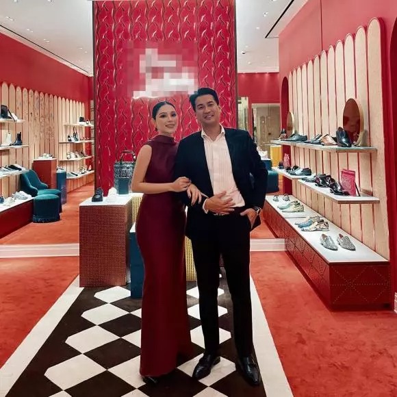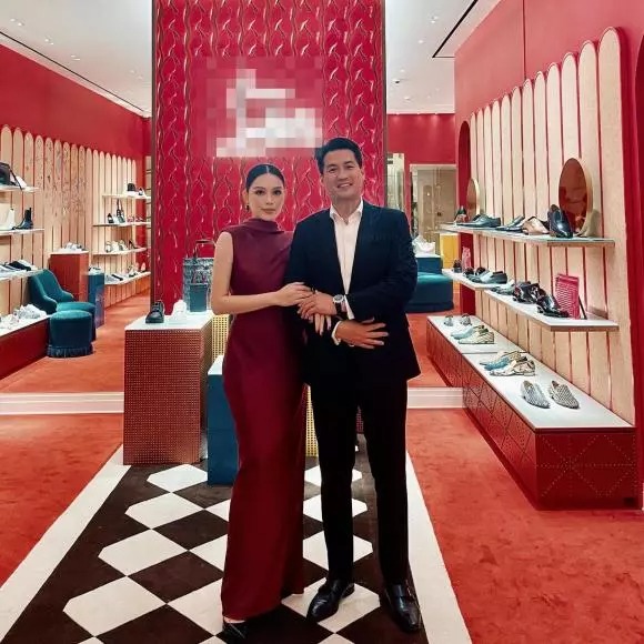 Mới đây, cặp người đẹp đại gia đã tham gia một sự kiện. Em dâu tương lai của Hà Tăng diện chiếc đầm đỏ kín đáo, tóc búi cao, trang điểm đậm, khoác tay hôn phu. Đôi trẻ cùng nở nụ cười hướng về phía ống kính máy ảnh.