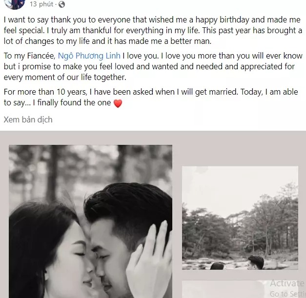 "Gửi đến người vợ sắp cưới của anh - Ngô Phương Linh, anh yêu em. Anh yêu em nhiều hơn những gì em có thể nghĩ.