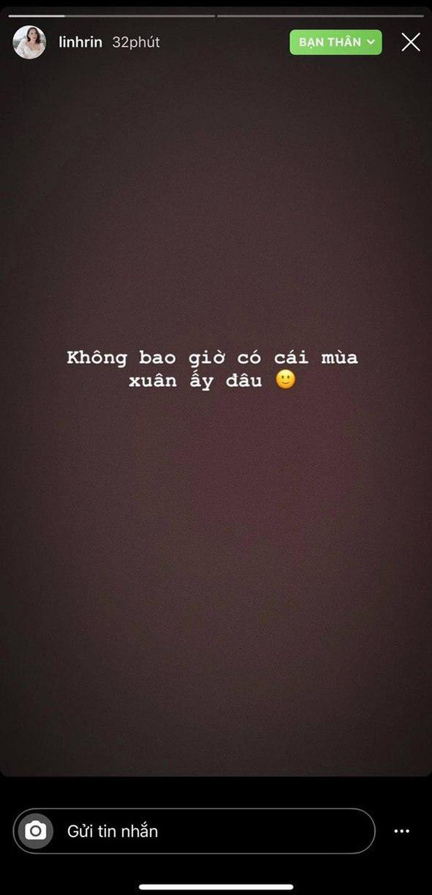 Mới đây nhất, Linh Rin tiếp tục có động thái mới trên trang cá nhân khiến người theo dõi tò mò. Nhiều người cho rằng có thể cô đang ám chỉ chuyện tình cảm. Cụ thể, cô nàng đã đăng tải một dòng cảm xúc với giọng khá đanh thép: "Không có cái mùa xuân đấy đâu". Không biết Linh Rin đang tự nói về mình hay muốn gửi lời tới "ai đó".