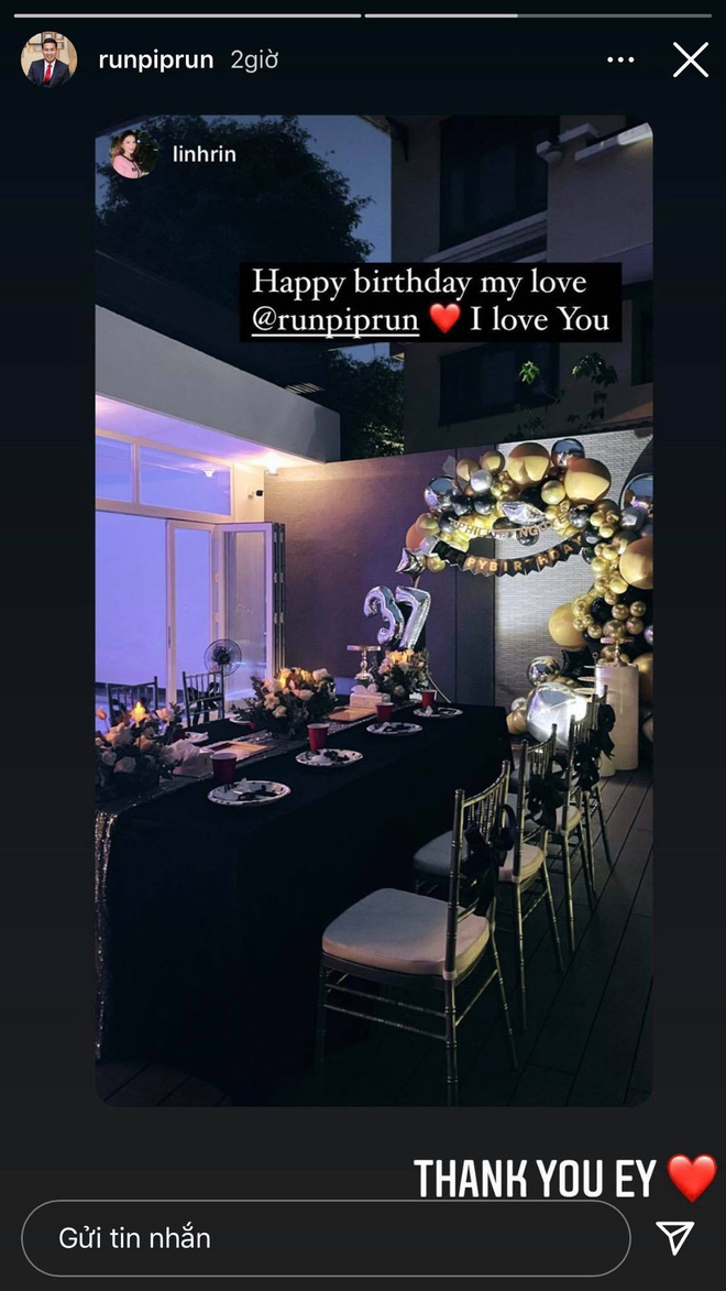 Trên trang cá nhân, Linh Rin đã đăng ảnh bàn tiệc ở bên ngoài biệt thự với bóng bay, hoa tươi và con số 37 - tuổi của Phillip Nguyễn. Cô nàng không quên viết caption ngọt ngào: "Happy birthday my love. I love you" (Tạm dịch: Chúc mừng sinh nhật tình yêu của em. Em yêu anh). Thiếu gia nhà họ Nguyễn liền reup lại và cảm ơn: "Thank you EY (em yêu).