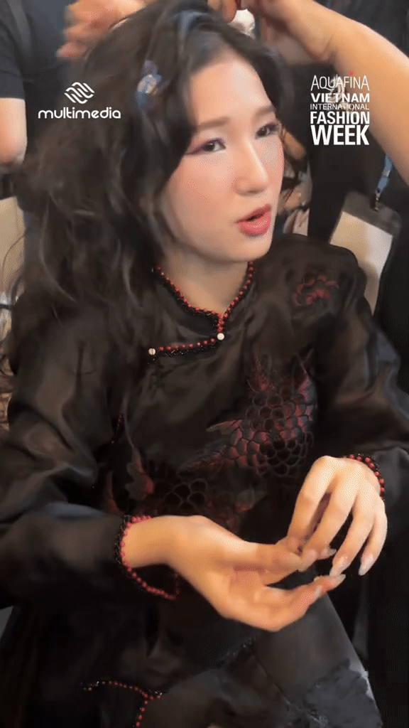 Trong khoảnh khắc này, mỹ nhân Gen Z đang vội vàng làm tóc, trang điểm ngay trước giờ G đi catwalk. Vì phải thay trang phục, làm lại tóc hoàn toàn nên cô nàng và ekip rất vội vàng. Lúc này, Nàng Mơ nói lớn với mọi người đang hỗ trợ mình:
