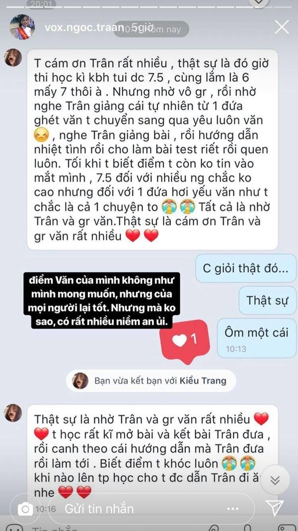 Hiện tại, Võ Ngọc Trân cũng chưa có động thái gì sau khi kết quả thi THPT quốc gia 2019 được công bố nhưng trước đó, cô nàng cũng từng chia sẻ lên story trang facebook cá nhân về việc điểm thi của mình sẽ không cao, cảm thấy hài lòng vì bản thân đã cố gắng và có định hướng riêng.