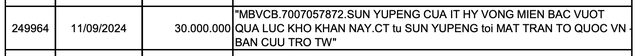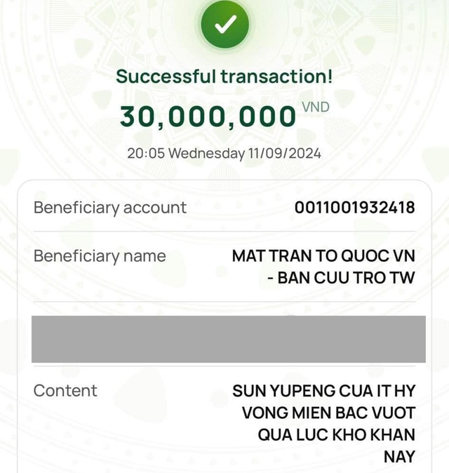 Vào 20h48 ngày 11/9, Tôn Bằng đăng tải ảnh màn hình đã chuyển khoản cho tài khoản Vietcombank của UBMTTQ với số tiền 30 triệu đồng kèm nội dung: “Sun Yupeng của ít hy vọng miền Bắc vượt qua lúc khó khăn này”.