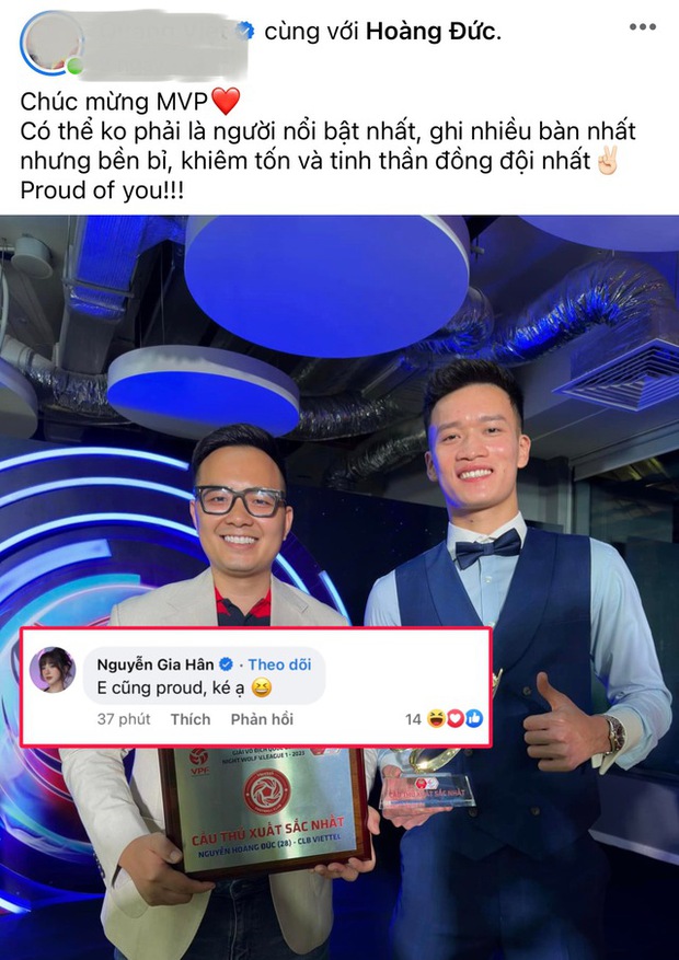 Mới đây tiền vệ Nguyễn Hoàng Đức với phong độ ổn định trong màu áo CLB Viettel đã giành giải thưởng Cầu thủ xuất sắc nhất V.League 2023. Sau lễ trao giải, người đại diện của tiền vệ sinh năm 1998 đã đăng bài trên trang cá nhân chúc mừng. Đáng chú ý dưới phần bình luận, Nguyễn Gia Hân đã để lại lời nhắn: "Em cũng tự hào, ké ạ" khi nói về Hoàng Đức.