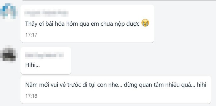 "Trước có đợt nghỉ lễ thế này mình cũng chưa kịp nộp bài. Nhắn cô thì cô cũng vui vẻ vậy nè. Cô bảo yên tâm mà nghỉ lễ, đón năm mới bên gia đình trước đi đã, rồi bài vở tính sau".