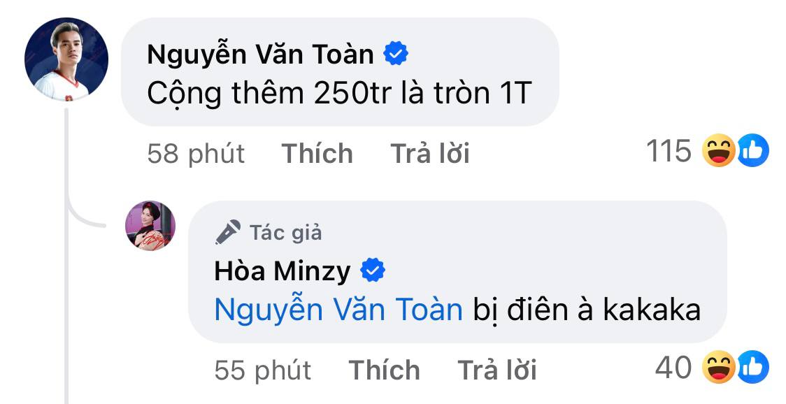 Dưới teaser của Hoà Minzy, Văn Toàn còn công khai đòi cát-xê từ cô bạn thân với số tiền 250 triệu đồng. Anh chàng còn nhắc thêm đến số tiền Hoà Minzy vẫn còn nợ mình, cộng với cát-xê lần này là tròn 1 tỷ. Trước màn đòi tiền của bạn thân, Hoà Minzy cảm thán: "Bị điên à".