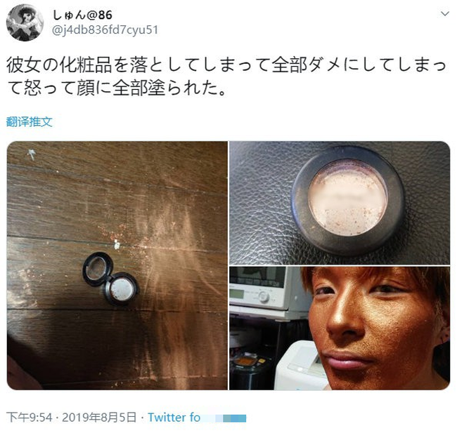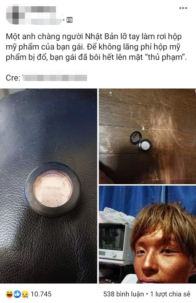 Bài đăng được chia sẻ trên MXH với nội dung khá ngắn gọn: "Một anh chàng người Nhật Bản lỡ tay làm rơi hộp mỹ phẩm của bạn gái. Để không lãng phí hộp mỹ phẩm bị đổ, bạn gái đã bôi hết lên mặt "thủ phạm".