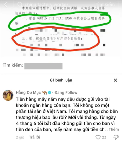 Cụ thể, tài khoản này cho biết Tôn Bằng tự nguyện giao Nhất Dương và Dịch Dương cho Hằng Du Mục nuôi, không phải phán quyết từ tòa án. Về tài sản, Tôn Bằng không yêu cầu chia tài sản của vợ cũ khi ly hôn, toàn bộ hoa hồng livestream của Hằng Du Mục đều ở trong tài khoản ngân hàng Việt Nam.
