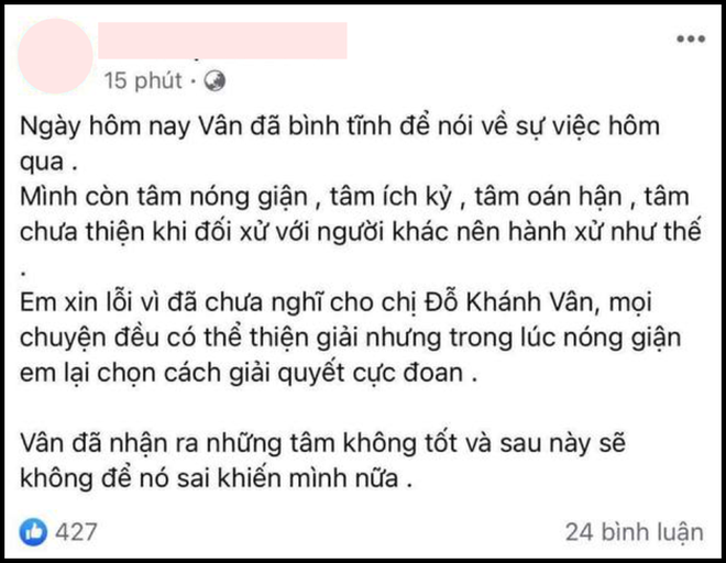 Nối tiếp sau đó là series xoá bài - xin lỗi - bóc phốt - xoá bài - xin lỗi của K.V khiến dân mạng không khỏi ngán ngẩm. Trong những diễn biến đó, nam chính của vụ việc là Phát La lại công khai bênh vực Khánh Vân. Kết quả cuối cùng của drama, Khánh Vân và bạn gái Phát La xin lỗi nhau làm huề, xem nhau như chị em.