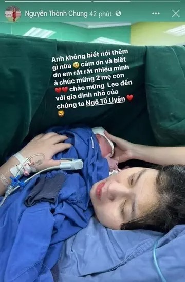 Trên Facebook cá nhân, tối 17/8 Nguyễn Thành Chung hạnh phúc thông báo bà xã Ngô Tố Uyên đã lâm bồn thành công. Đăng ảnh mẹ tròn con vuông, trung vệ của đội tuyển Việt Nam có lời nhắn nhủ xúc động đến vợ.