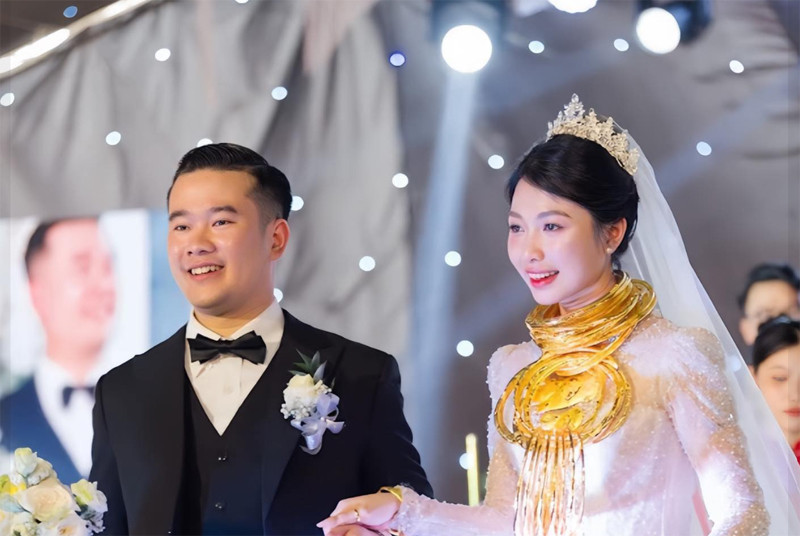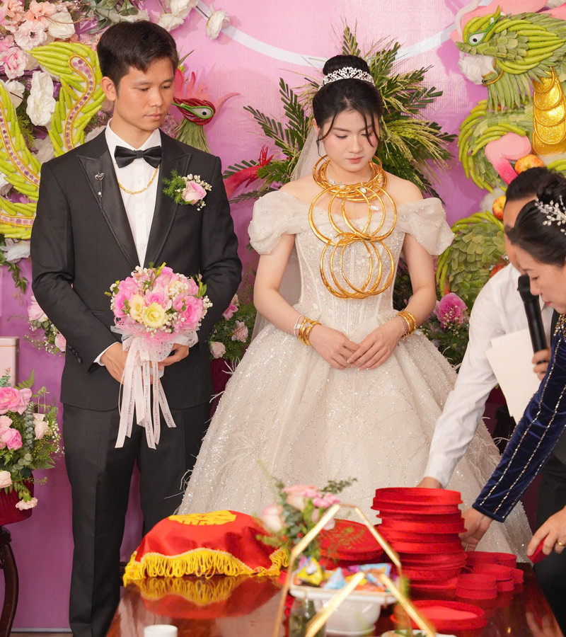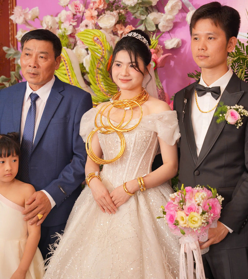 Trong ngày cưới, cô dâu đeo tổng cộng 15 cây vàng trên người. Trong đó, kiềng vàng trên cổ được xếp thành 3 tầng khiến người nhìn choáng váng. Cổ tay, ngón tay cô dâu cũng đeo ngập nhẫn vàng, vòng vàng.