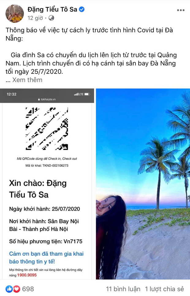 "Mặc dù đã liên hệ hotline bộ y tế báo cáo lộ trình chi tiết và được cho phép đi làm bình thường sau khai báo y tế. Tuy nhiên, trên tinh thần "Vì sức khoẻ bản thân và cộng đồng", gia đình mình đã tự giác khai báo y tế và chủ động tự cách ly tại gia trong vòng 14 ngày!" - Tô Sa chia sẻ thêm.