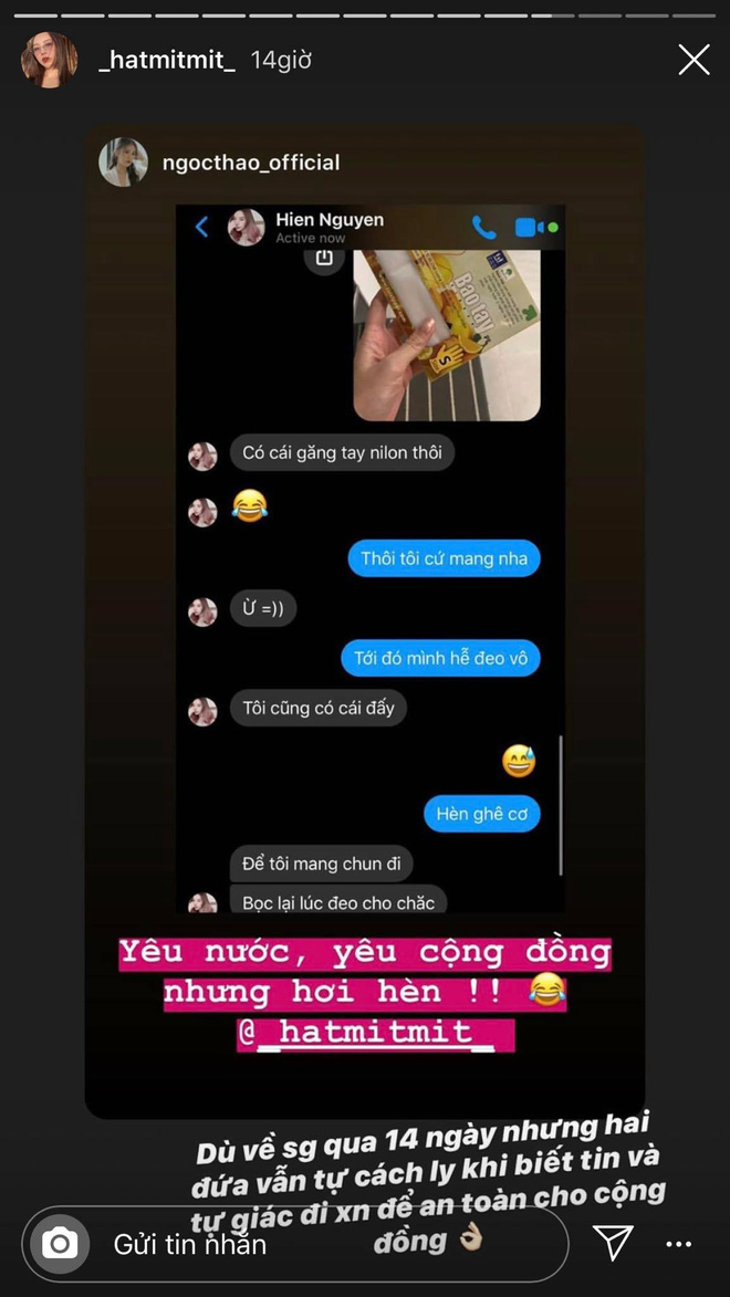 Cụ thể, dù đã ở Hội An từ ngày 12/7 nhưng Ngọc Thảo và Hạt Mít tự giác cách ly tại nhà. Sáng nay (29/7), cả 2 tiếp tục tự nguyện đi xét nghiệm. Liên hệ với Ngọc Thảo, cô nàng cho biết đã xét nghiệm xong xuôi và đang đợi kết quả.