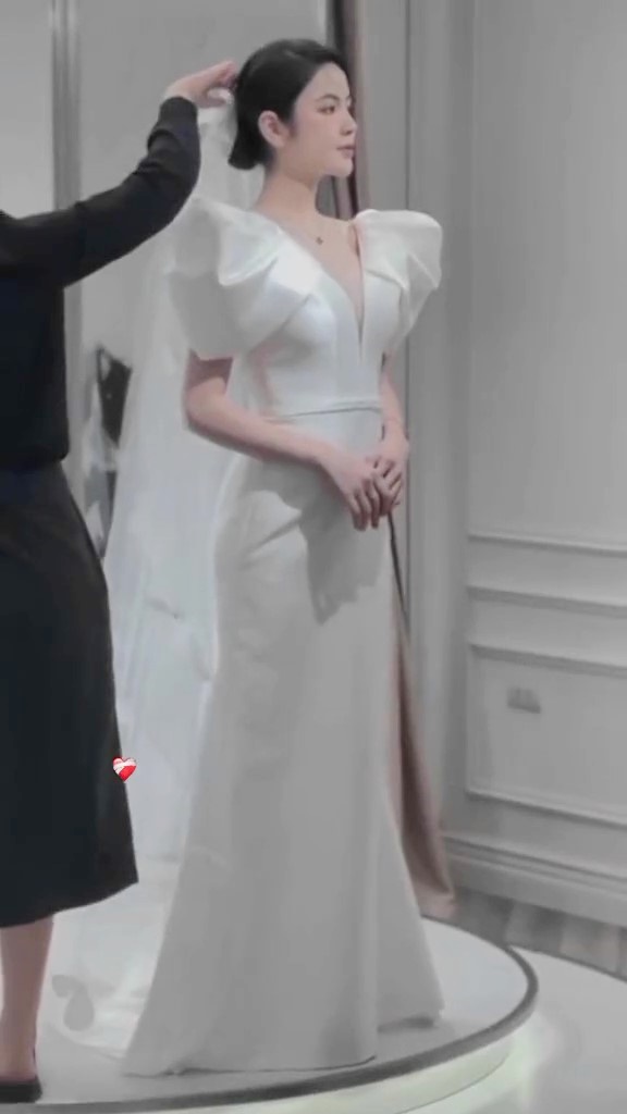 Ngoài ra một bộ váy cưới khác được vợ Quang Hải thử cũng bị nhận xét là cồng kềnh vì phần tay váy phồng to lên.