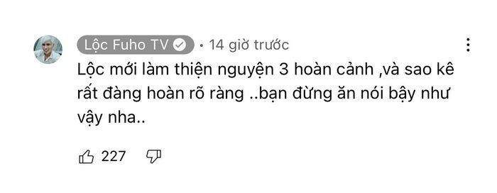 Theo đó, Lộc Fuho bức xúc giải thích: "Lộc mới làm thiện nguyện 3 hoàn cảnh và sao kê rất đàng hoàng rõ ràng. Bạn đừng ăn nói bậy như vậy nha".
