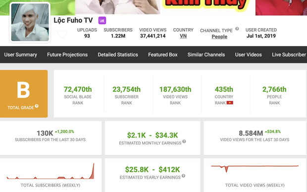 Theo Social Blade - một trang web theo dõi, thống kê và phân tích các trang mạng xã hội khá uy tín, kênh của Lộc Fuho hiện đang đứng thứ 435 về độ nổi tiếng tại Việt Nam. Với quy mô, lượt subscribe cũng như lượt view thu về, nếu bật nút kiếm tiền thì doanh thu mỗi tháng của Lộc Fuho sẽ là 2.100 đô - 34.300 đô (khoảng 48 triệu - 780 triệu VNĐ). Còn doanh thu mỗi năm sẽ dao động trong khoảng 25.800 đô - 412.000 đô (khoảng 590 triệu - 9,4 tỷ VNĐ).