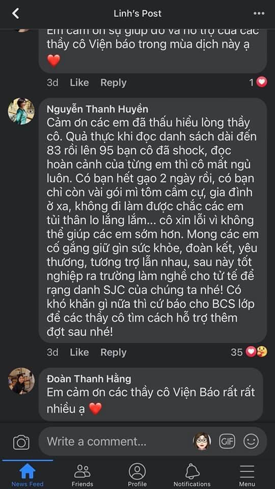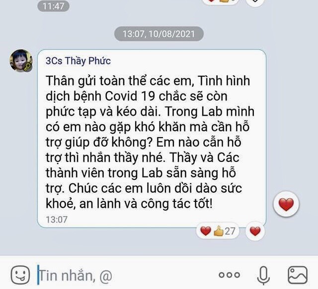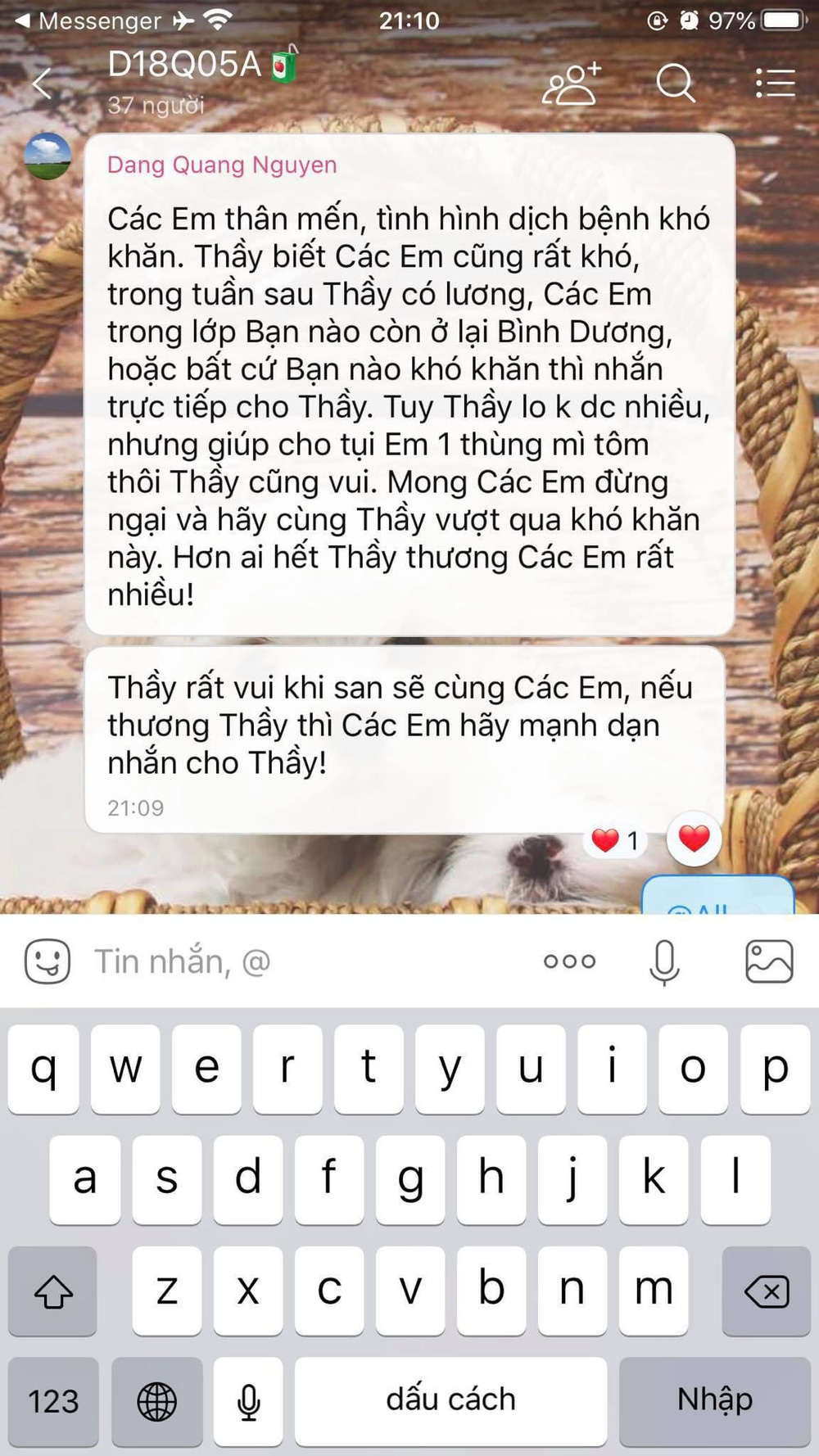 Thầy mình bình thường giảng online thầy hay hỏi thăm tình hình các bạn ở đâu, khỏe không, sống tốt không... xong tự nhiên tối nay thầy nhắn vào group lớp như vậy, đọc xong mà xúc động quá!"