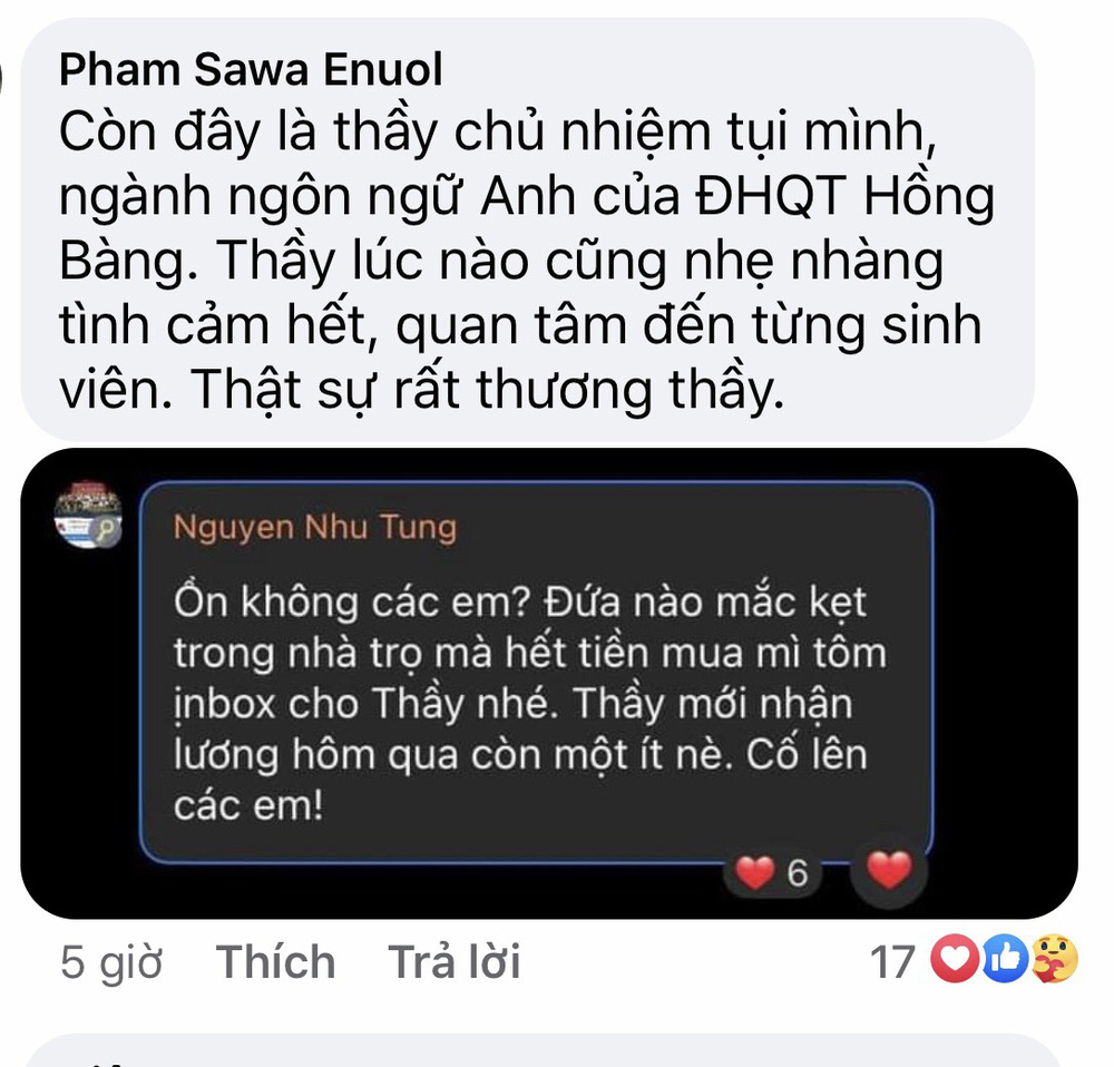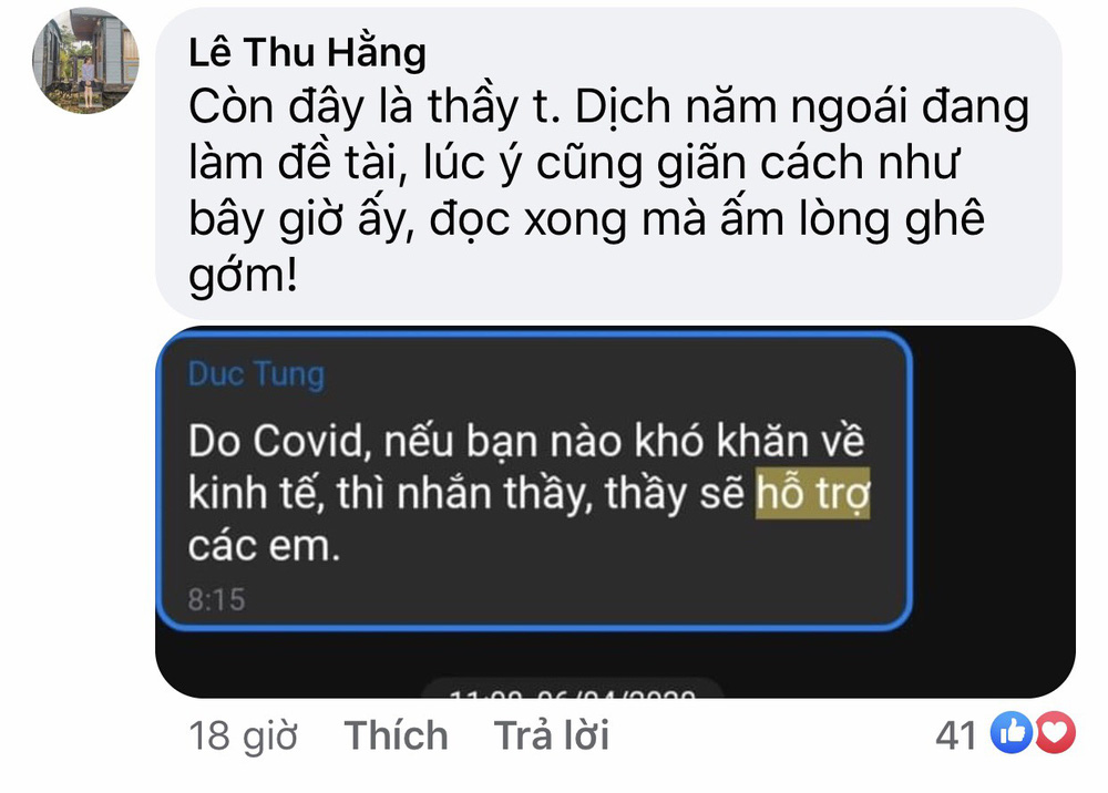 Chia sẻ trên mạng xã hội, bạn Phương Anh, 22 tuổi, là sinh viên năm cuối của trường tâm sự: "Mùa dịch này chắc ai cũng khó khăn. Mọi người có ai từng là sinh viên mà được thầy giáo quan tâm thế này chưa?