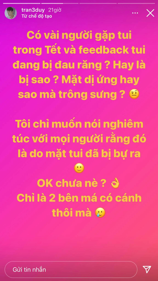 Éo le nhất phải kể đến cựu hot boy Trần Ba Duy - bố Đậu. Cực chẳng đã, Ba Duy đã phải lên mạng thú nhận rằng mặt mình bị bự ra chứ không phải đau răng hay sưng do dị ứng như mọi người tưởng.