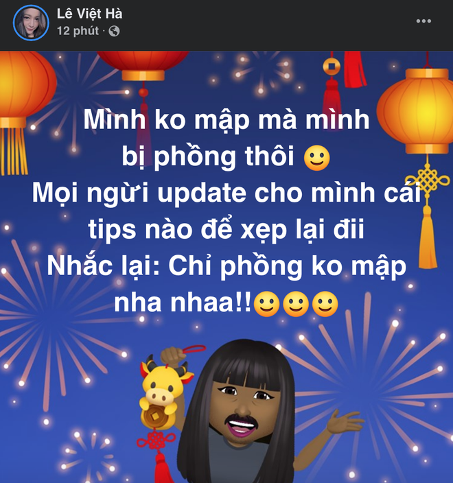 Hết Tết, Lê Việt Hà (Zoie) - cựu thành viên sáng lập St.319 đùa rằng mình chỉ phồng chứ không mập. Có điều làm thế nào để xẹp thì Việt Hà không biết.